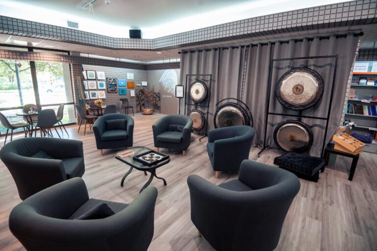 It’s a gift shop and community gathering space with an Angel Wing photo wall, Tibetan healing bowls, and beautiful display of sacred gongs.
