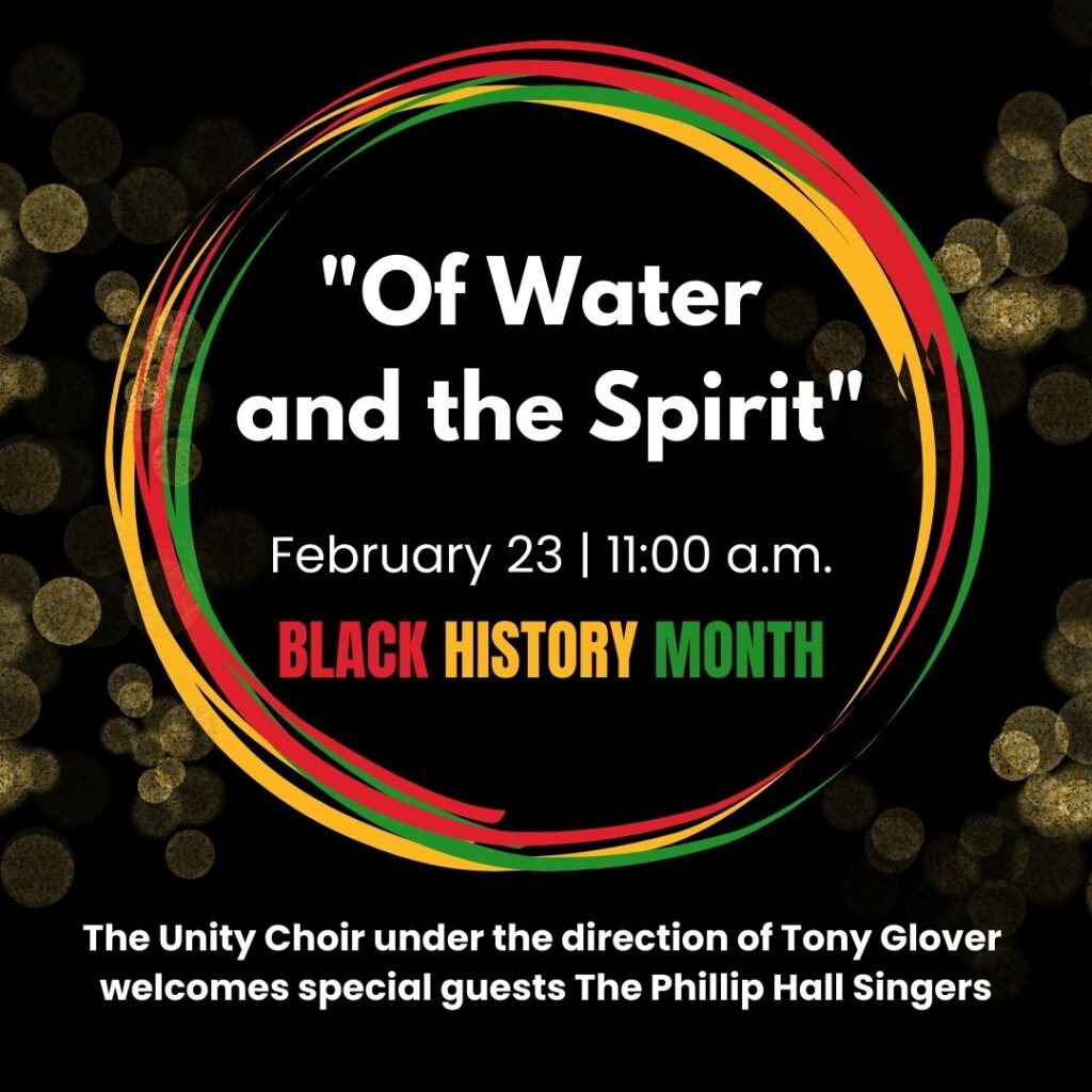 Black History Month at Unity culminates with a musical celebration. The Unity Choir, under the direction of Tony Glover, welcomes special guests, Reginald Smith Jr. and The Phillip Hall Singers, to explore themes of water and the Spirit in African-American spirituality. Join us for this celebratory Sunday!